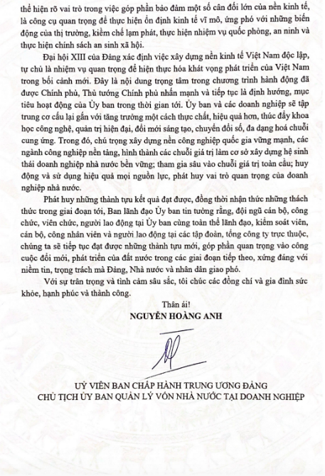 Nhân dịp kỷ niệm 4 năm hoạt động của Ủy ban Quản lý vốn nhà nước tại doanh nghiệp (29/09/2018 - 29/09/2022), Đồng chí Nguyễn Hoàng Anh - Uỷ viên Ban Chấp hành Trung ương Đảng, Chủ tịch Ủy ban Quản lý vốn nhà nước tại doanh nghiệp có Thư chúc mừng, gửi tới cán bộ, công chức, viên chức, người lao động tại Ủy ban cùng toàn thể lãnh đạo, kiểm soát viên nhà nước, cán bộ, công nhân viên và người lao động tại 19 tập đoàn, tổng công ty trực thuộc.