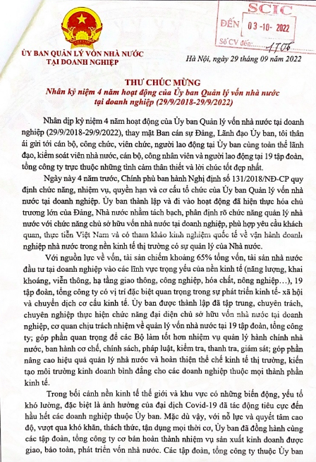 Thư Chúc mừng nhân kỷ niệm 4 năm hoạt động của Ủy ban Quản lý vốn nhà nước tại doanh nghiệp (29/09/2018 - 29/09/2022)