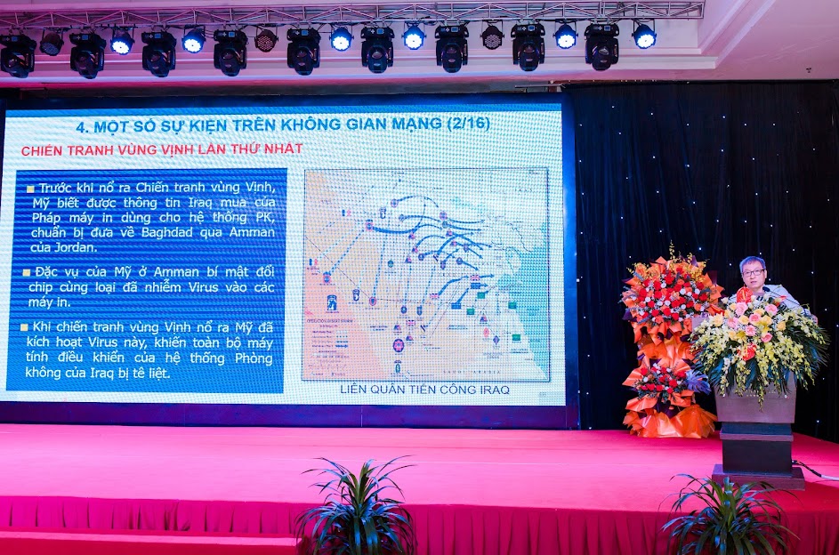 Trung tướng PGS. TS Đinh Thế Cường - Nguyên Tư lệnh Bộ Tư lệnh 86, trình bày về vấn đề về một số vấn đề bảo vệ Tổ quốc trên không gian mạng