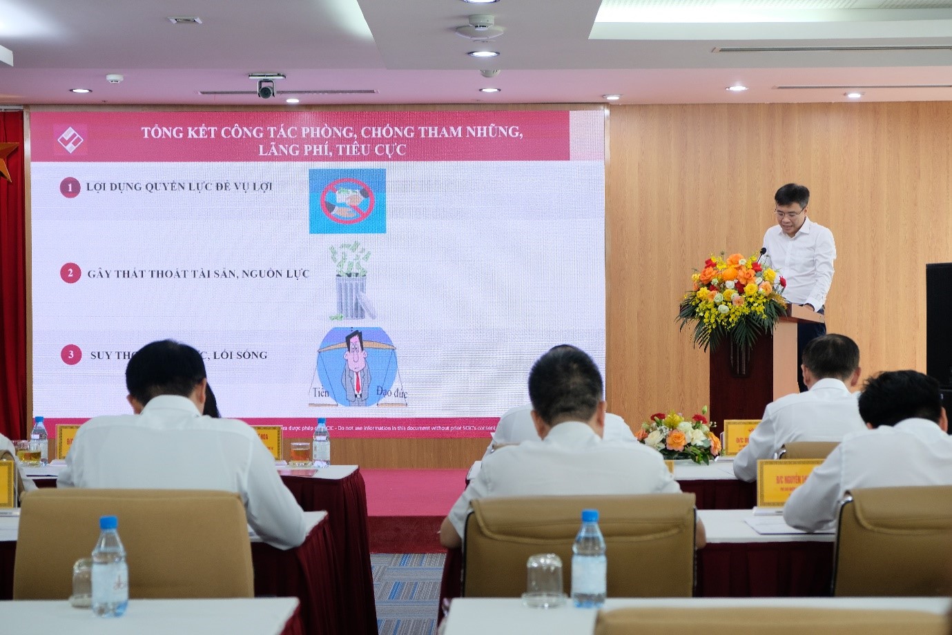 Thay mặt Đảng uỷ SCIC, đồng chí Lê Thanh Tuấn – Uỷ viên Ban chấp hành Đảng bộ, Phó Tổng giám đốc SCIC báo cáo tổng kết công tác phòng, chống tham nhũng, lãng phí, tiêu cực của Tổng công ty.