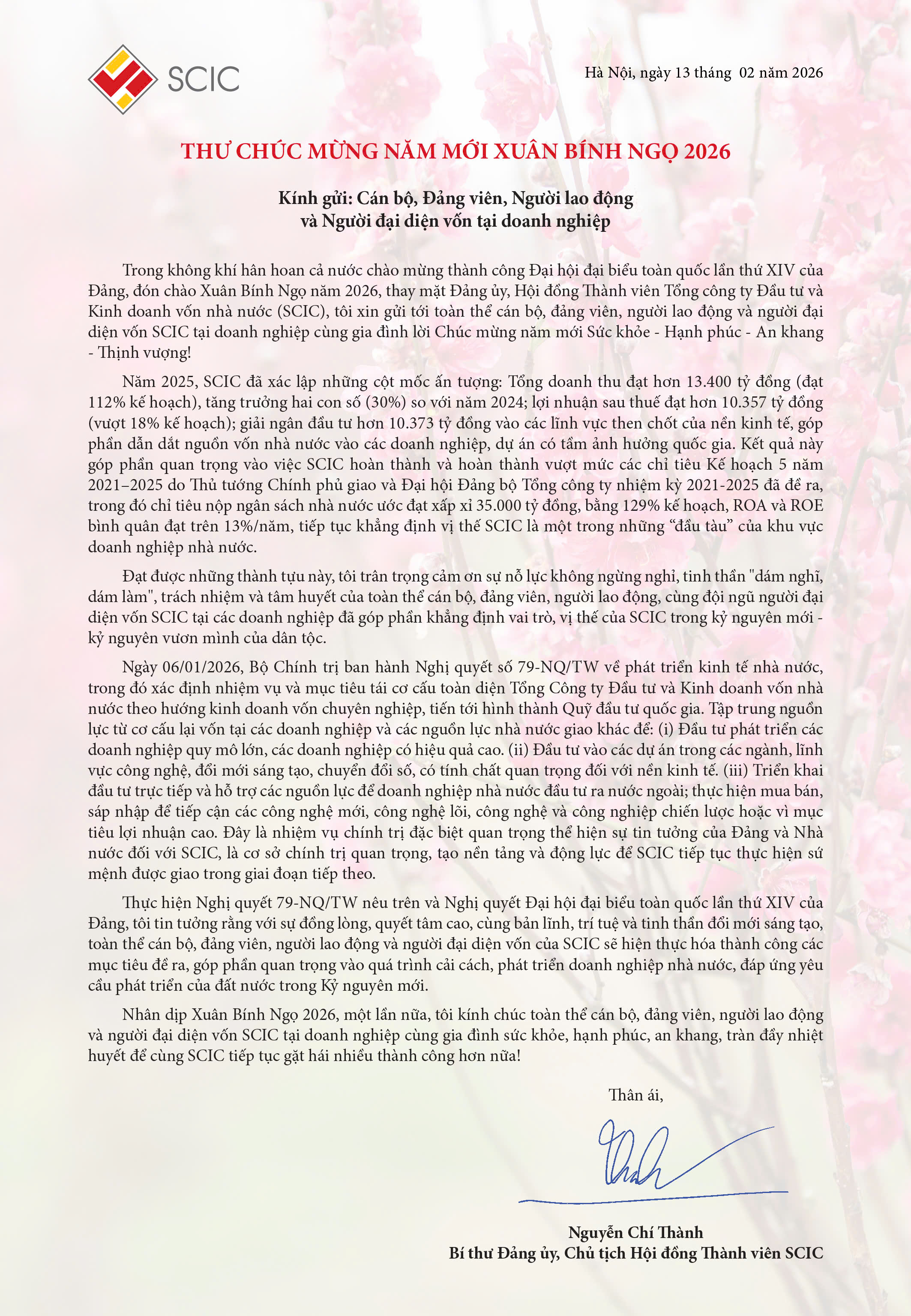 Nhân dịp năm mới 2026, đồng chí Nguyễn Chí Thành – Bí thư Đảng ủy, Chủ tịch Hội đồng thành viên SCIC có Thư chúc mừng gửi tới Cán bộ, Đảng viên, Người lao động và Người đại diện vốn SCIC tại các doanh nghiệp.