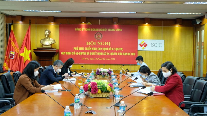 Thực hiện Công văn số 698-CV/ĐUK, ngày 16/02/2022 của Đảng ủy Khối Doanh nghiệp Trung ương về việc tổ chức Hội nghị phổ biến, triển khai 03 quy định, quyết định của Ban Bí thư, bao gồm: (1)Quy định số 47-QĐ/TW ngày 20/12/2021 “về chức năng, nhiệm vụ của đảng bộ, chi bộ cơ sở trong doanh nghiệp do nhà nước nắm giữ 50% vốn điều lệ trở xuống”; (2) Quy định số 48-QĐ/TW ngày 20/12/2021 “về chức năng của đảng bộ, chi bộ cơ sở trong doanh nghiệp nhà nước”; (3) Quyết định số 54-QĐ/TW ngày 11/01/2022 “về ban hành Quy chế phối hợp công tác giữa Đảng uỷ Khối DNTW với ban cán sự đảng bộ, ngành và đảng đoàn các cơ quan Trung ương”, chiều ngày 18/2/2022 tại điểm cầu Đảng ủy Khối DNTW, đồng chí Nguyễn Chí Thành- Bí thư Đảng ủy, Chủ tịch HĐTV SCIC tham dự trực tiếp Hội nghị phổ biến, triển khai 03 quy định, quyết định của Ban Bí thư nêu trên. Tại điểm cầu SCIC, các đồng chí trong thành phần triệu tập của Đảng ủy tham dự trực tuyến.