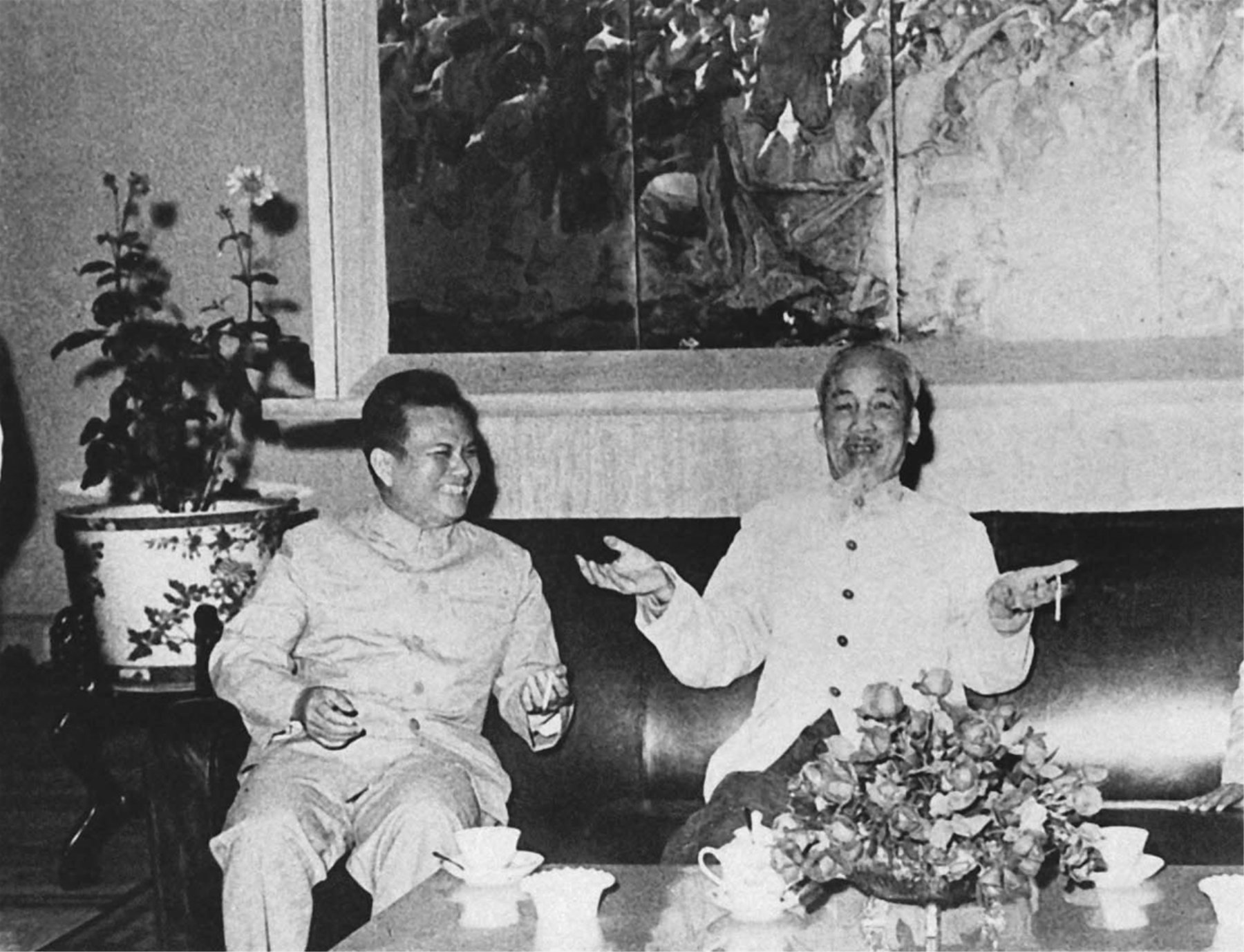 Chủ tịch Hồ Chí Minh tiếp và nói chuyện thân mật với đồng chí Kaysone Phomvihane, Trưởng Đoàn đại biểu Đảng và Mặt trận Lào yêu nước sang thăm hữu nghị Việt Nam (1966)_Ảnh: Tư liệu