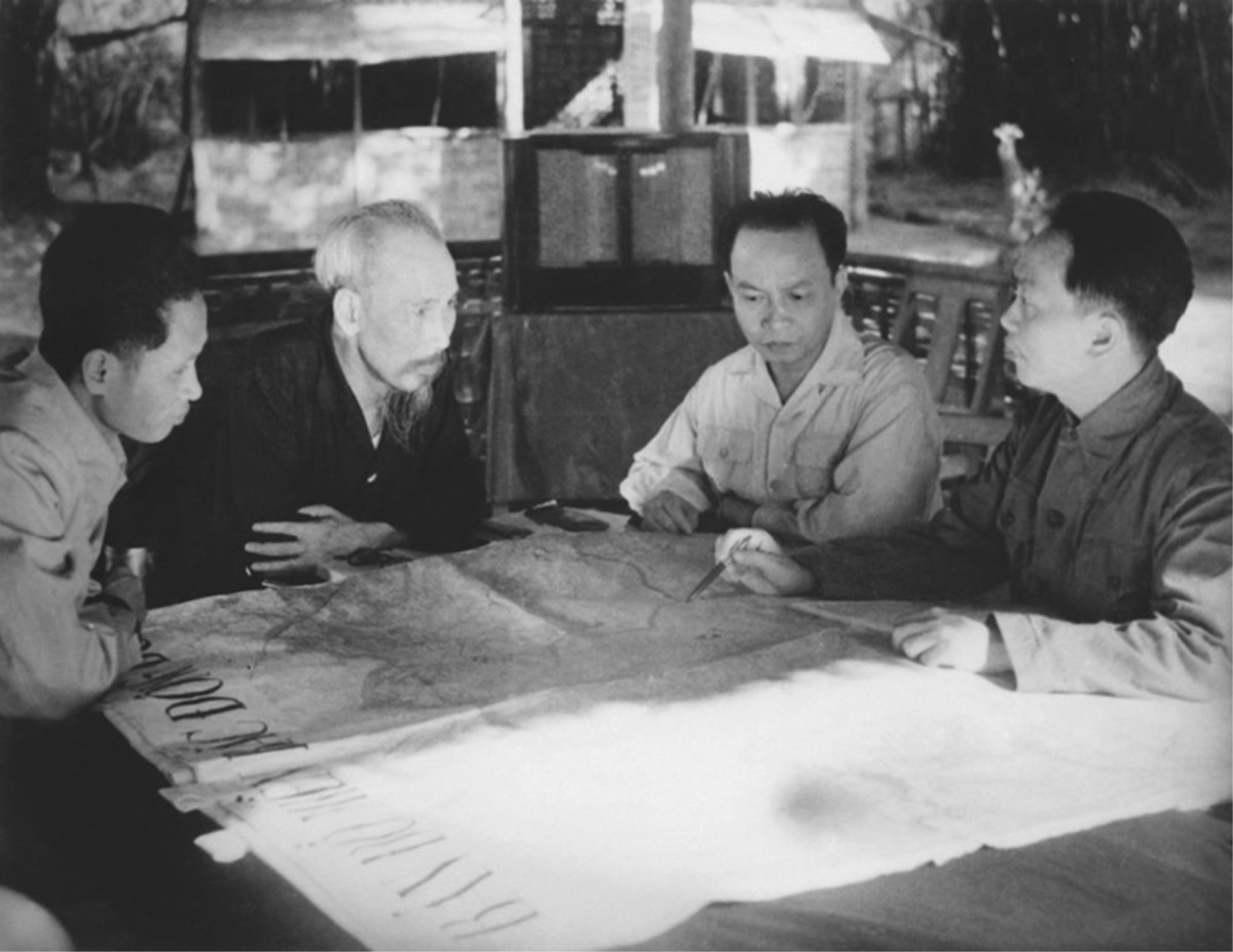 Chủ tịch Hồ Chí Minh và các đồng chí trong Ban Thường vụ Trung ương Đảng họp quyết định mở Chiến cuộc Đông Xuân 1953-1954 và Chiến dịch Điện Biên Phủ (xã Phú Đình, huyện Định Hóa, tỉnh Thái Nguyên cuối năm 1953). Ảnh tư liệu