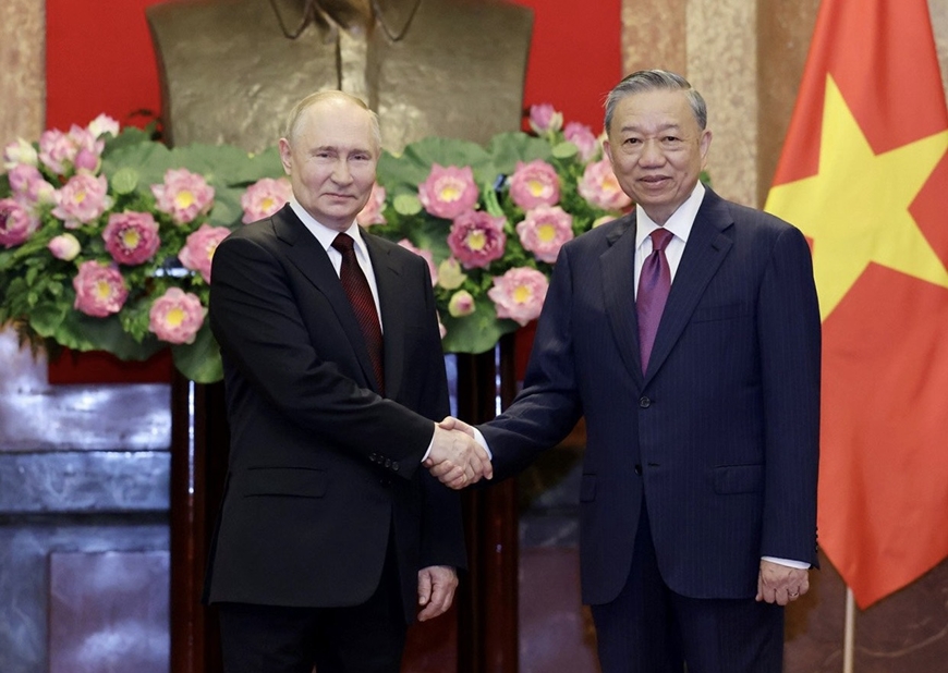 Chủ tịch nước Tô Lâm chủ trì lễ đón trọng thể Tổng thống Liên bang Nga Vladimir Putin thăm cấp Nhà nước tới Việt Nam, ngày 20-6-2024. Ảnh: TRỌNG HẢI